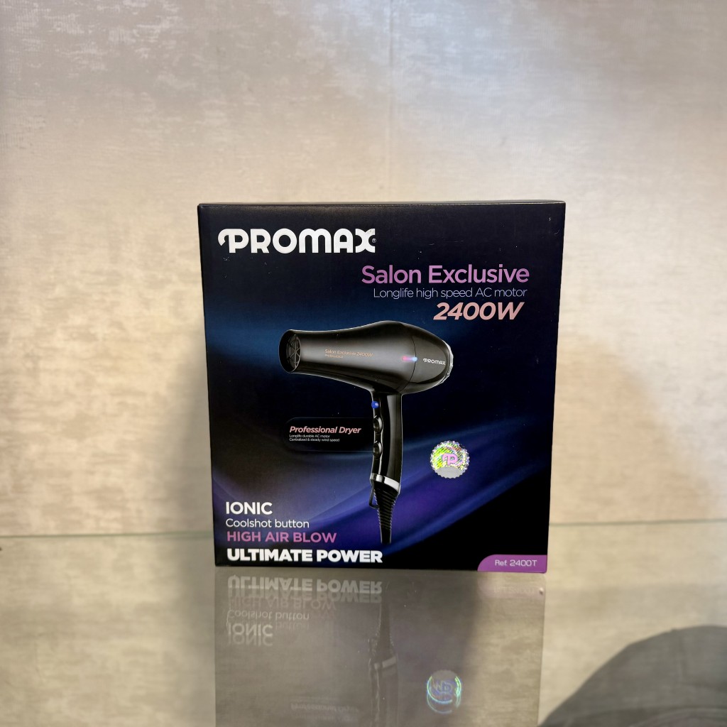 سشوار پرومکس مدل 2400T یکی از جدید ترین سشوار پرومکس است که 2400 وات قدرت حرارت دارد. این سشوار دارای قابلیت آیونیک دائم است. فناوری تولید یون باعث میشود که موها در اثر حرارت، کمتر وز و خشک شوند و درخشش طبیعی خود را حفظ کنند. علاوه بر این در این سشوار دکمه کول شات یا باد سرد، برای سردکردن ناگهانی هوا در نظر گرفته شده است. عملکرد این دکمه به منظور تثبیت حالت مو بعد از سشوارکردن بوده و بهمحض رهاکردن این دکمه، دما مجدد بالا میرود. در بدنه این سشوار چراغی بکار رفته که علاوه بر زیبایی مشهودی که به بدنه سشوار داده است، شما را از میزان حرارت آگاه می کند. به ای ترتیب که در حرارت پایین به رنگ آبی و در حرارت بالا به رنگ قرمز خواهد بود. موتور این سشوار دارای دور موتور 20500RPM و یا دور بر دقیقه است که توان پرتاب باد قابل قبولی را بدست می دهد. همچنین در این سشوار از نسل جدید پروانه های سشوار استفاده شده است. در این پروانه ها با افزایش تعداد پره ها، جریان هوا بهتر و به صورت کاملا مستقیم به محیط اطراف پرتاب می شود. همچنین این سشوار دارای دو سری با طول 60 میلی متر و 75 میلی متر دارد که کاربرد آن را برای استفاده مختلف میسر می سازد. سشوار پرومکس 2400T با ولتاژ 220 ولت، توان مصرفی 2400 وات و المنت سرامیکی قدرتمند انتخابی ایدهآل برای افراد حرفه ای به حساب میآید. سیم 3 متری این سشوار حرفه ای به شما آزادی عمل کافی برای کار کردن با آن را در جهتهای مختلف میدهد.